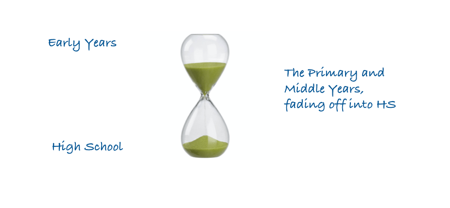 It may make sense to think of a whole-school curriculum that stresses entrepreneurialism as taking the shape of an hourglass. During Early Years, the curriculum maximizes opportunities for exploration, discovery, and self-directed learning. It looks the same (at an age appropriate level) in High School. The curriculum narrows in the middle, when it is time to learn core skills (e.g. writing, pre-algebra, the Scientific Method). This means a few more constraints during those years when it is important to master and apply with intention phonics, spelling, arithmetic, organization, and so forth.