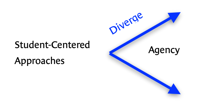 I am not suggesting we abandon agency, only that we move beyond the approaches that have learning experiences stop at student-centered, as if this were the Shangri-La where the world will be made right. We need to go beyond student-centered approaches. By providing choice and voice, student-centered approaches ideally break free of the externally-imposed constructs of education that often reward compliance over creativity. Student-centered approaches encourage divergent thinking by encouraging and nurturing curiosity, exploration, self-pacing, discover, and creation. This is all great, but we need more.