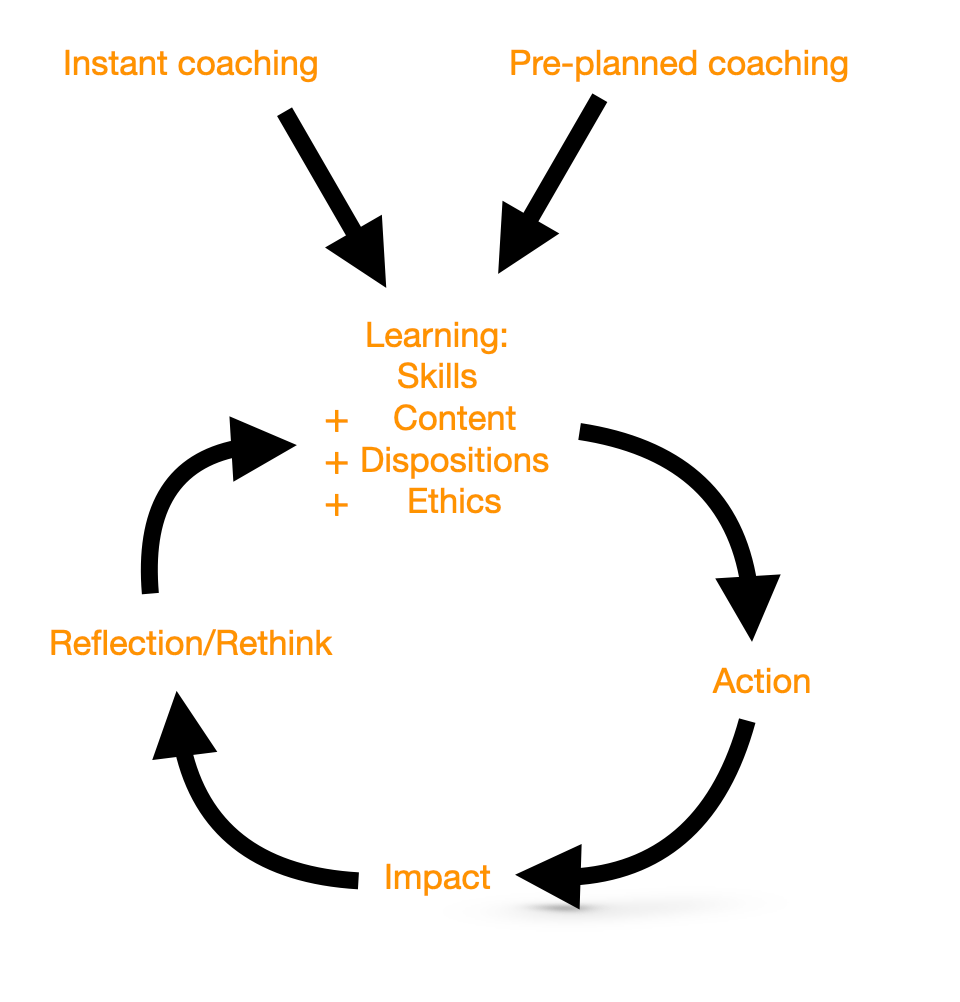 Coaches develop learners through skills development both on the spot and in more planned ways. Skills are put to use in action, for purpose. The impact of our actions toward the collective purpose is all we need to know and we can reflect on impact to hone our skills, content knowledge, dispositions and ethics. Maybe it could look like this: