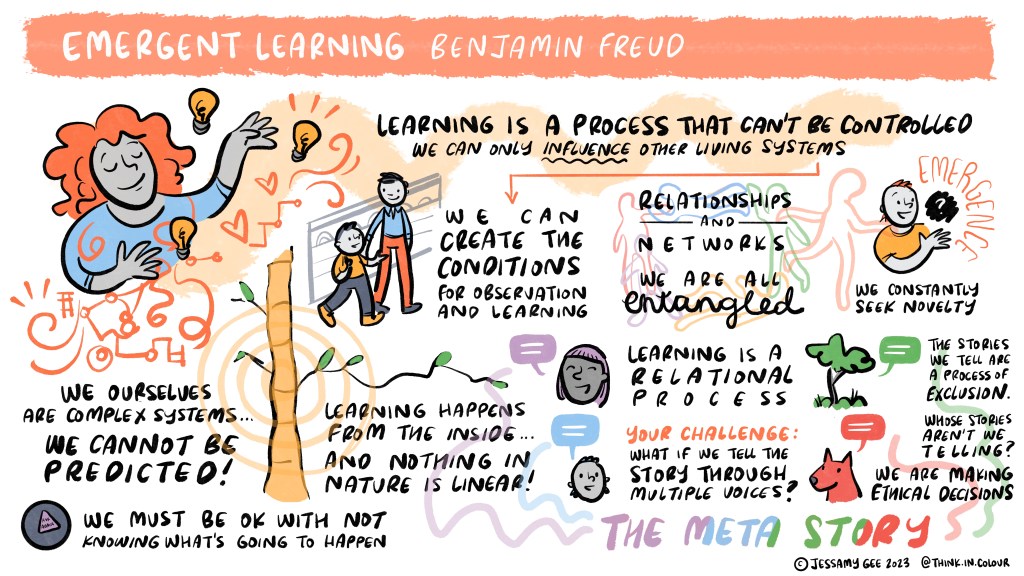 During this session, we explored the concepts underlying emergent learning and collaboratively design learning contexts that foster its emergence, utilizing living systems approaches. The intention was to foster creativity, freedom, and a shared sense of values and direction toward which we are collectively moving. It may be wild, but it’s not the Wild West! Emergent learning is about re-wilding the learning experience to cultivate possibilities and (bio-)diversity. Below is the capture of the session.